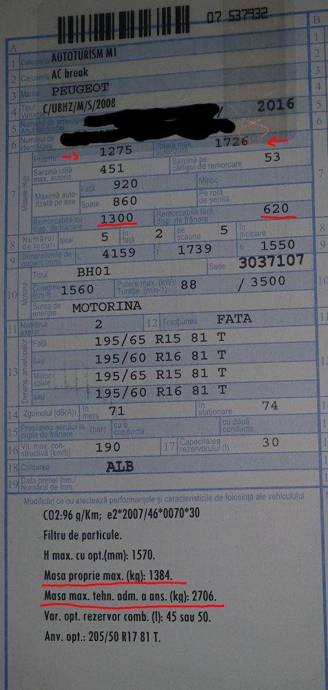 Daniel Gft 5 Semnalează Publicat 19 Noiembrie, 2020 Buna ziua, Scriu aici pentru ca nu stiu unde s-ar potrivi mai bine intrebarea mea. Pana sa ajung la ea prezint un pic masina - un Peugeot 2008 din 2016, motor diesel 1.6 de 130 cp, cuplu undeva pe la 300 Nm. Masina a fost achizitionata de noua cu o reducere destul de mare deoarece era pe stoc de cca 2 ani (eu am achizitionat-o in februarie 2018 de la sectiunea vehicule cu livrare imediata de pe siteul peugeot). De atunci am facut cca 45000 km si sunt foarte multumit de ea. Fiind pe stoc nu am putut opta pentru nici o optionala dar a venit cu aproape tot ce as avea nevoie (mai putin geamuri electrice spate). Sunt extrem de incantat de ea, mai ales de volanul ce seamana cu unul de consola (are un diametru mai mic decat cel standard). Acum intrebarea (pentru care am atasat si o poza din cartea tehnica) - care este masa maxima pe care o pot tracta? Pun aceasta intrebare din cauza notelor prezente in carte: Masa proprie 1275 Masa maxima autorizata - 1726 Masa remorcabila cu dispozitiv de franare - 1300 / 620 fara dispozitiv de franare iar la note (in partea de jos a pozei) Masa proprie maxima - 1384 Masa max. tehn.adm.a ans - 2706 (banuiesc ca inseamna masa maxima tehnica admisa a ansamblului masina + remorca) Eu am facut urmatorul calcul: Masa max. tehn adm a ans - masa maxima autorizata => 2706 - 1726 = 980 kg. Este corect cum am facut? Aceasta este masa maxima pe care o pot tracta sau masa maxima este cea de la pct 7 din carte - 1300 kg? Va deranjez cu aceasta intrebare pentru ca in functie de aceasta valoare pot alege o eventuala rulora. Va multumesc anticipat pentru raspunsuri sa va urez o zi buna! Daniel Distribuie această postare Link către postare Distribuie pe alte siteuri