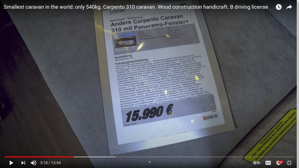 NRLaurentiu 2.051 Semnalează Publicat 30 Iunie, 2021 Pe canalul de YouTube al televiziunii Germane, a aparut astazi prezentarea celei mai mici rulote - Carpento 310, de numai 4, 4 m in total si cu masa la gol de doar 540 Kg (MMTA de 750 Kg). La cat este de mica, este impresionant ca printre dotari are chiar si o cabina de toaleta cu dus, de dimensiuni rezonabile (in care nu te simti inghesuit precum in modelul englezesc BareFoot). De asemenea, printre dotarile optionale au fost incluse un boiler de 5 sau 10 litri, o baterie de acumulatori, dar si un rezervor de 50 litri de apa! Designul rulotei si ma refer la vederea panoramica din partea din fata, chiar daca nu este ceva original si este intalnit sub diverse forme la Eriba, Fendt (daca nu ma insel), precum si la cateva modele din SUA, impresioneaza prin felul in care a fost implementat. Totul la circa 16.ooo Euro. 3 1 Distribuie această postare Link către postare Distribuie pe alte siteuri