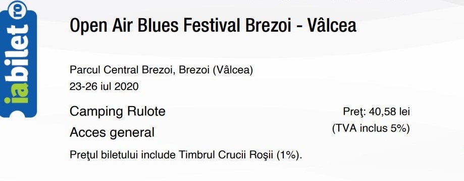 Va salut prieteni. Am doua bilete de campare la Festivalul de muzica blues del la Brezoi din perioada 19-24 iulie 2022. Le-am cumparat in 2019 pentru concertul care trebuia sa se tina in 2020. Cum acesta nu s-a mai tinut din motive de pandemie, biletele sunt valabile pentru festivalul din acest an. eu am sunat la un nr de telefon de pe site-ul lor ( https://www.facebook.com/OpenAirBluesFestivalBrezoi ) si mi-au cofirmat acest lucru. Nu stiu daca biletele sunt valabile pentru toata perioada festivalului pentru ca ar fi fost pentru prima oara cand mergeam. Nici anul acesta nu ajung deoarece sotia are concediu in august. Rog doritorul sa afle mai multe detalii pentru a nu avea surprize.