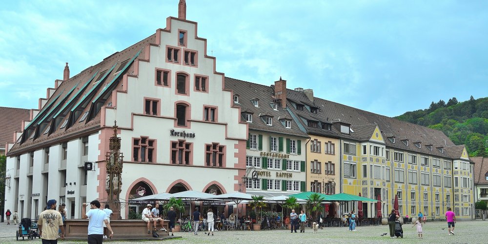 "Primul „magazin municipal” a fost construit în secolul al XIV-lea în Schusterstraße ca o clădire pentru administrația pieței municipale pentru manipularea mărfurilor și vămuirea în Freiburg; prima mențiune datează din 1378. Începând cu 1520, actuala clădire cu vedere spre Münsterplatz și spre Freiburg Minster a fost ridicată la nord de vechiul „magazin”. Finalizarea „Neues Kaufhaus” datează din 1532. Arhitectul clădirii nu este pe deplin documentat, dar se presupune că a fost unul dintre maeștrii constructori care lucrau la Freiburg Minster la acea vreme, probabil Lienhart Müller din Ettlingen."