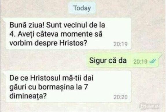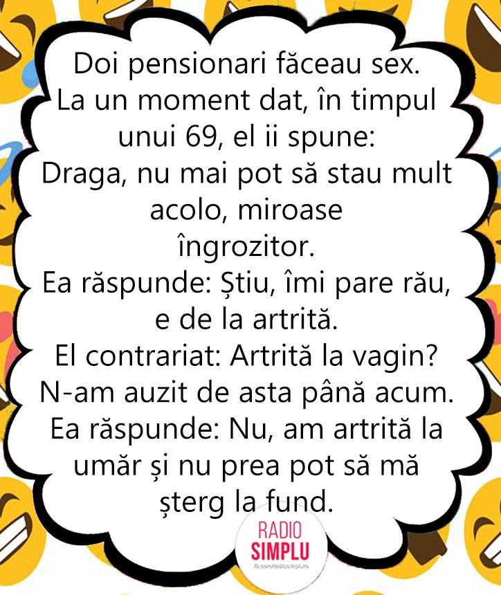 Doru Negru 158 Semnalează Publicat 6 Noiembrie, 2017 Motto: Omul nu e facut sa munceasca! Dovada: faptul că oboseste! ------------------------------ ------------------------------ ---------------- - Tata, spune-mi, de ce barbatii de la noi nu pot avea mai multe sotii, asa cum e in Africa? - Esti inca mic, fiule. Cand vei creste, o sa intelegi ca intr-un stat civilizat legea ii apara pe oameni... ------------------------------ --------- Un ardelean care tusea ca naiba se duce la medic. Doctorul il consulta si il intreaba cu o voce grava: - Fumati? Dupa cateva momente de ezitare, ardeleanul raspunde: - Mai bine as bea ceva! ------------------------------ --------- "Tânar aratos, situatie materiala exceptionala, post de mare raspundere, relatii bune, doua masini, vila in Caraibe. Nu caut nimic, doar ma laud." -------------------------------- O doamna, aflata la volan, vede in fata ei doi barbati catarandu-se pe un stalp de telegraf. Trecand pe langa ei, le striga: - Hei, nu va speriati, am carnet de 10 ani de zile ! ------------------------------ --------- - De ce ai venit la mine, îl întreabă un dentist pe un tigan, care avea toti dintii imbracati in aur ? - Ham venit sa-mi pui o Halarma. ------------------------------ --------- - Garcon! Graines de citrouilles salees! - Striga fa: "Samanta de bostan cu sare", ca n-a stat toti la Paris ca tine... ------------------------------ --------- Tiganul pleaca la razboi, lasandu-și nevasta si cei trei copii acasa. Dupa trei ani se intoarce de pe front si se duce acasa cu sufletul la gura, stiind ca orasul lor fusese bombardat. Isi gaseste nevasta, o imbratiseaza, apoi isi vede copiii si-i imbratiseaza plangand: - Dragii tatei, din trei ati mai ramas doar cinci! ------------------------------ --------- Căsătoria – singurul joc de noroc binecuvântat de biserică! ------------------------------ --------- Să nu faci nimic e tare greu ... Nu știi când trebuie să te oprești ! ------------------------------ --------- Un tip se trezeste cu o mahmureala groaznica si vede scris pe perete : MAINE NU BEAU ! - Slava Domnului ca nu astazi ! ------------------------------ --------- Un arab intra intr-un bar din America. Se duce la barman si îi spune : - Ahrem bahra mahji Coca Cola ! La care barmanul, nelamurit : - Un pahar mare si rece cu ce ? ------------------------------ --------- Anunt la "Matrimoniale" pe timp de criza : „Caut FEMEIE rezistenta la frig, foame si bataie. Rog seriozitate !”. ------------------------------ ------------------------------ -------------- – Iubitule, îți dai seama? Vom sta împreună toată viața! – Ei, hai… deja trecem la amenințări? ------------------------------ --------- În stația de autobuz, o bătrânică, cu mâinile tremurânde, încearcă să butoneze ceva la telefon. Alături stă un tip tânăr: – Tinere, ajută-mă să trimit un SMS… – Nici o problemă. Ce să scriu? – Scrie așa: „Ticălosule, nu mă căuta, am plecat la mama" … ------------------------------ ------------ Discuție între prietene: – Mi-a jurat că are cele mai bune intenții… – Voia să te ceară în căsătorie? – Nu știu, pentru că tocmai atunci a apărut nevastă-sa! ------------------------------ --------- La maternități a fost introdus un nou Aviz: ”Acum, la naștere, poate asista și tatăl copilului, nu numai soțul mamei !” ------------------------------ --------- - Care e diferenta dintre un nevrotic, psihopat si un psihiatru ? - Nevroticul construieste castele in aer, psihopatul locuieste in ele, iar psihiatrul cere chiria... ------------------------------ --------- - Care este diferenta dintre doctori si pacienti intr-un spital de psihiatrie ? - Pacientii se fac bine si pleaca. ------------------------------ ------------------ De ce durează mai putin psihanaliza la bărbati ? Nu mai e nevoie să-i readuci în copilărie, pentru că ei sunt deja acolo. ------------------------------ -------------------------- - Ce se intampla cand un psiholog si o prostituata petrec o noapte impreuna ? - Dimineata amandoi zic : 100 de dolari, te rog. ------------------------------ --------- Trei ruşi călătoreau în aceeaşi cuşetă dintr-un tren transsiberian. Unul dintre ei citea un ziar, în timp ce ceilalţi doi spuneau bancuri cu Putin. Enervat de faptul că nu putea citi în linişte ziarul, primul rus s-a hotărât să le joace o festă celor doi. A ieşit discret din cuşetă şi i-a comandat însoţitorului de vagon trei ceaiuri, cu menţiunea să-i fie aduse exact peste 10 minute. A reintrat în cuşetă şi, după nouă minute, le-a spus celor doi : — Băieţi, ar trebui s-o lăsaţi mai moale cu bancurile politice în tren. FSB - ul are microfoane în toate cuşetele şi compartimentele. — Rahat, hai să fim serioşi ! Cine a mai auzit de microfoane în trenuri în zilele noastre ? — Serios, hai să vă arăt ! După care, a spus cu glas tare : "Tovarăşe maior, trei ceaiuri, vă rog !" N-au trecut decât câteva secunde şi însoţitorul vagonului a intrat cu cele trei ceaiuri. Cei doi călători s-au albit la faţă şi nu au mai scos nici un cuvânt până s-au culcat. Dimineaţa, tipul glumeţ s-a trezit singur în compartiment. Curios, l-a întrebat pe însoţitor unde sunt cei doi. Acesta i-a răspuns că, în timpul nopţii, cei doi au fost ridicaţi de FSB. — Bine, bine, dar pe mine de ce m-au lăsat în pace ? — Tovarăşului maior i-a plăcut poanta cu ceaiul ! --------------------------------------------------------- Dacă cineva îţi va spune vreodată că munca ta este neprofesională, aminteşte-i că Arca lui Noe a fost construită de un amator, iar Titanicul a fost construit de profesionişti...! -------------------------------------------------------- Dacă iubeşti două persoane în acelaşi timp, alege-o pe a doua. Dacă o iubeai pe prima, nu ar mai fi existat a doua! 1 Distribuie această postare Link către postare Distribuie pe alte siteuri