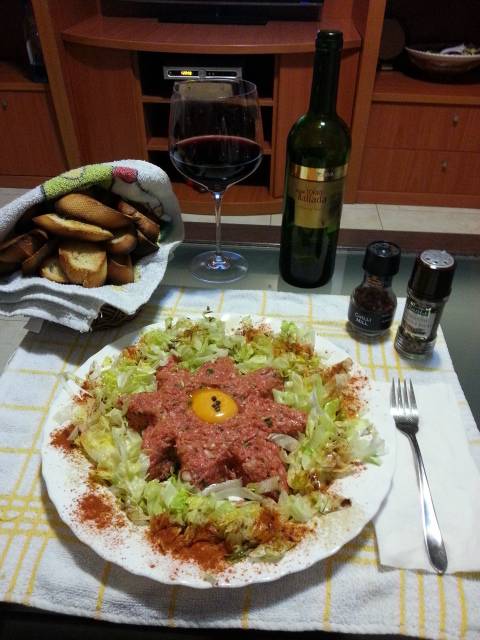 Cornel Mihailescu 1.987 Semnalează Publicat 8 Octombrie, 2016 Si dupa ceva , , mestereala " a iesit ceva pe masura asteptarii. Un biftec tartare pe placul meu acompaniat de un vinisor ...rouge. Distribuie această postare Link către postare Distribuie pe alte siteuri