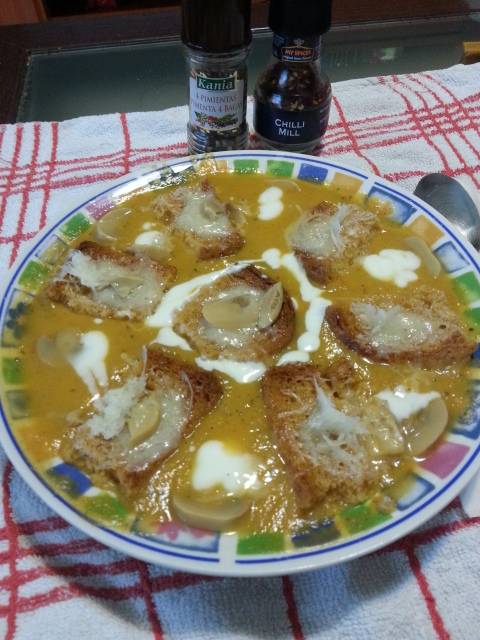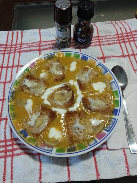 Cornel Mihailescu 1.987 Semnalează Publicat 29 Octombrie, 2016 Salutare Astazi pentru pranz am gatit o supa- crema de legume. Am garnisito cu ceva crutoane integrale presarate cu branza Serrano. Si cateva ciupercute de decor sa zic asa. Plus ceva condimente. Si iata ce a iesit. Distribuie această postare Link către postare Distribuie pe alte siteuri