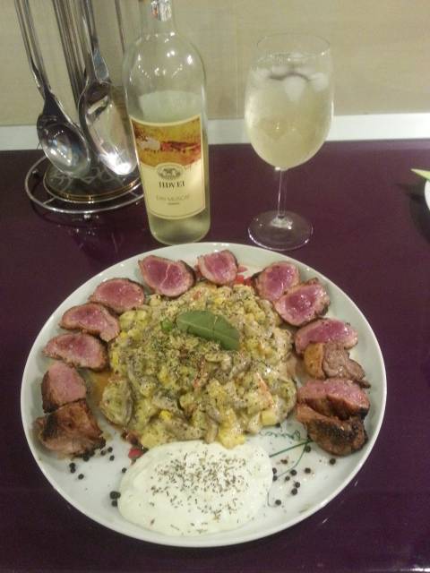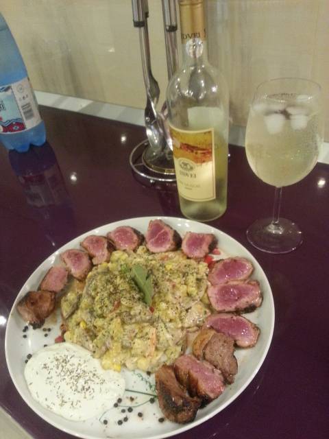 Cornel Mihailescu 1.987 Semnalează Publicat 27 August, 2016 ...Asa cum am scris mai devreme revin cu , , mastersefia " Asa ca am trecut la fapte. Am preparat piept de rata cu legume sotate in sos tartare si separat un sos alb cu tarhon. Si de , , gura " am brumat un Dry Muscat de Jidvei .( fata tavalita in iarba ). Distribuie această postare Link către postare Distribuie pe alte siteuri