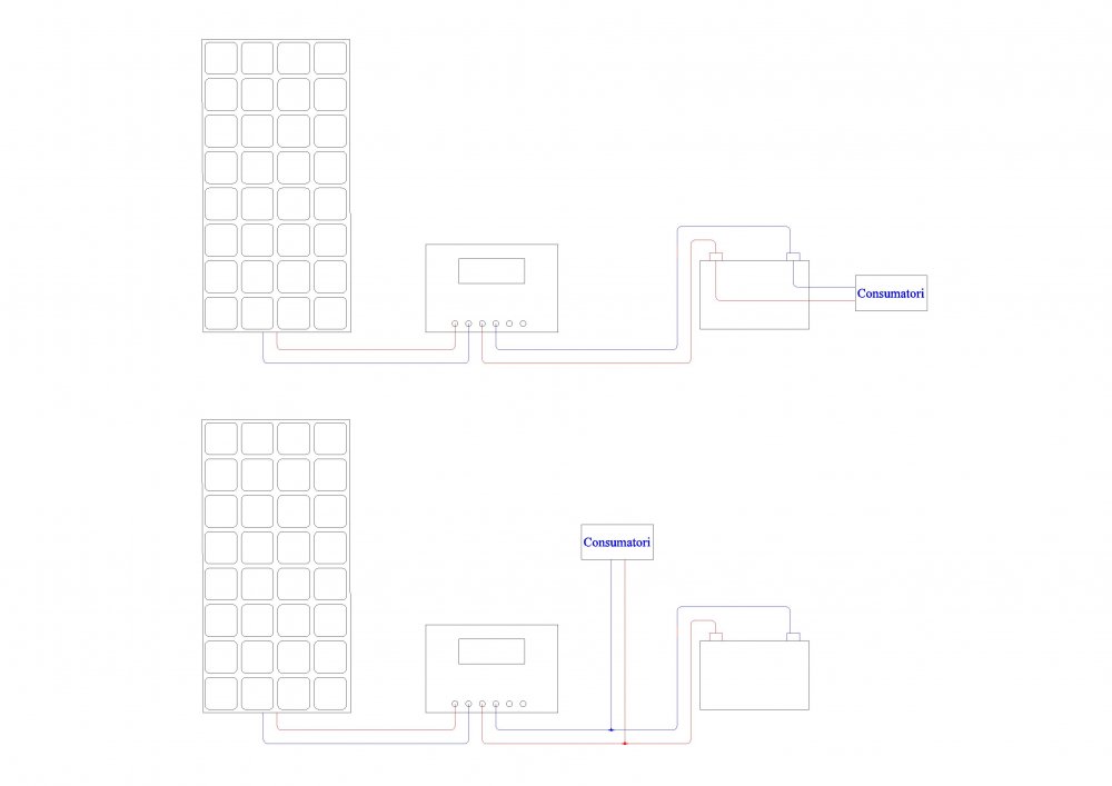 Am si eu o intrebare pentru cei in domeniu,   in imaginea atasata mai jos, in partea de sus este schema corecta a unei  conexiuni Panou-Regulator-Acumulator-Cosumatori, in partea de jos, pe legaturile dintre regulator si acumulator se intervine si pleaca legaturile spre consumatori, intrebare este corecta aceasta conexiune, exita vreun risc pentru baterie, consumatori ?