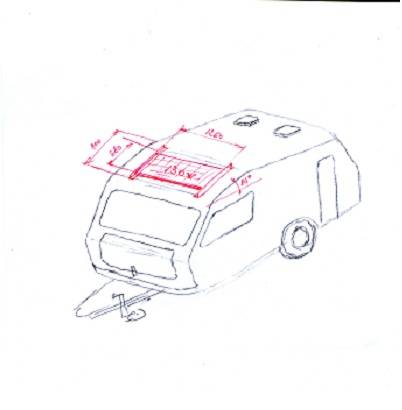 M-am gandit la amplasarea pe plafonul rulotei in zona marcata in schita (plafonul este inclinat in acea zona cu cca. 14 grd, iar sinele de sprijin din Al se pot monta cu suruburi pe intariturile din lemn situate in plafon, la distanta de 800mm). Nu-mi convine gaurirea plafonului dar, acoperisul este un fel de coaja din plastic care nu pare a fi lipita prea bine si intim cu izolatia din interior. M-am gandit ca este riscant sa recurg numai la lipire (ceea ce mi-ar fi fost pe plac !). Pot sa-l fac si partial orientabil, pe balamale (solutia lui @Daniel-P), avand in vedere ca zona aleasa este ceva mai joasa si as putea accede mai lesne.