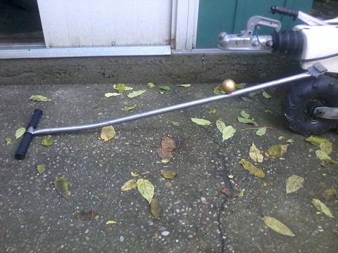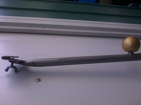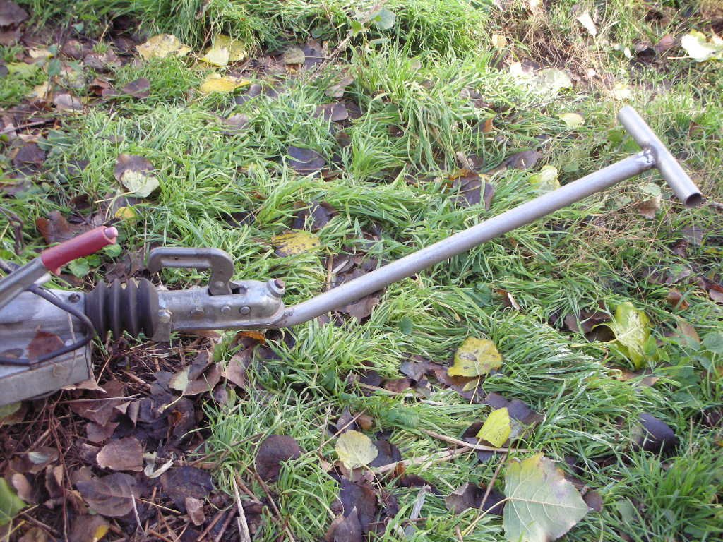 Mi-am amintit de pozele dispozitivului de manevrare promise...     In prima este detaliul prinderii pe traversa protapului iar in a 2-a se poate observa cam pe unde se afla traversa pe care se face prinderea.      Procedura de instalare:    Se introduce dispozitivul sub protap, cu sfera tangenta sub cupla si se trage pana se blocheaza (este confectionat astfel incat sa se ghideze exact);     se ridica simultan cu ridicarea manerului de blocare a cuplei;     se lasa manerul cuplei pt. a se bloca sfera;    se strange surubul cu fluture (va patrunde printr-o gaura de 6, 5 mm pe care am practicat-o in traversa mentionata).