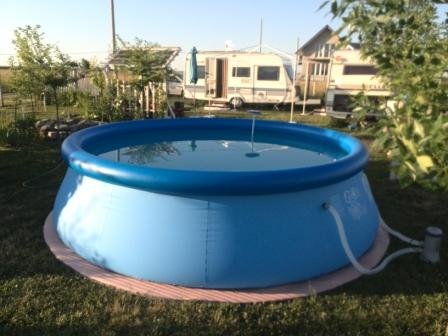 Asa cum probabil unii dintre voi stiti, detin un teren intravilan de 400 m patrati in com. Letca Noua din jud.Giurgiu, acolo unde-mi tin si rulotele...Se afla cam la 30 Km de la iesirea din Bucuresti in directia Alexandria si l-am cumparat in 2009 simtind nevoia unui loc unde sa ma refugiez in week-end cu prietenii la aer curat ( la cateva sute de metri se afla o padure si o balta salbatica), la un gratar, muzica, distractie si bineinteles :default_fac_cinste: Incet-incet l-am amenajat cu cateva lucruri de baza; pomi fructiferi, gazon, apa curenta, foisor verde, dus, toaleta, o fantana arteziana, gratar, iluminat cu ajutorul panourilor solare si de anul trecut mi-am luat si o piscina supraterana cu pompa de recirculare sa ne racorim in zilele toride de vara...Ma rog, nu vreau sa detaliez mai mult, ideea era ca incepand cu 1 Mai intentionez sa invitam alaturi de noi in week-end colegi rulotisti din Bucuresti sau apropiere (cu rulota sau fara) la un gratar, plaja, muzica, bere rece.../.; Le pot asigura loc de campare, apa, WC, curent, gratar, dush, umbra sau plaja ( un fel de mini-camping ) si toate astea GRATIS...Astept primavara ca mai am cateva lucruri de pus la punct si de la 1 Mai vreau sa-i dau drumu' la treaba /.;