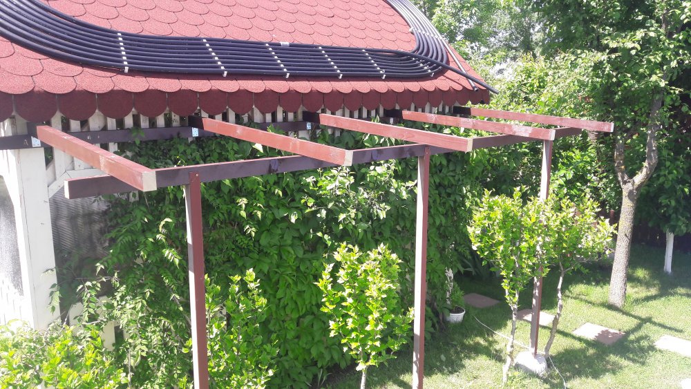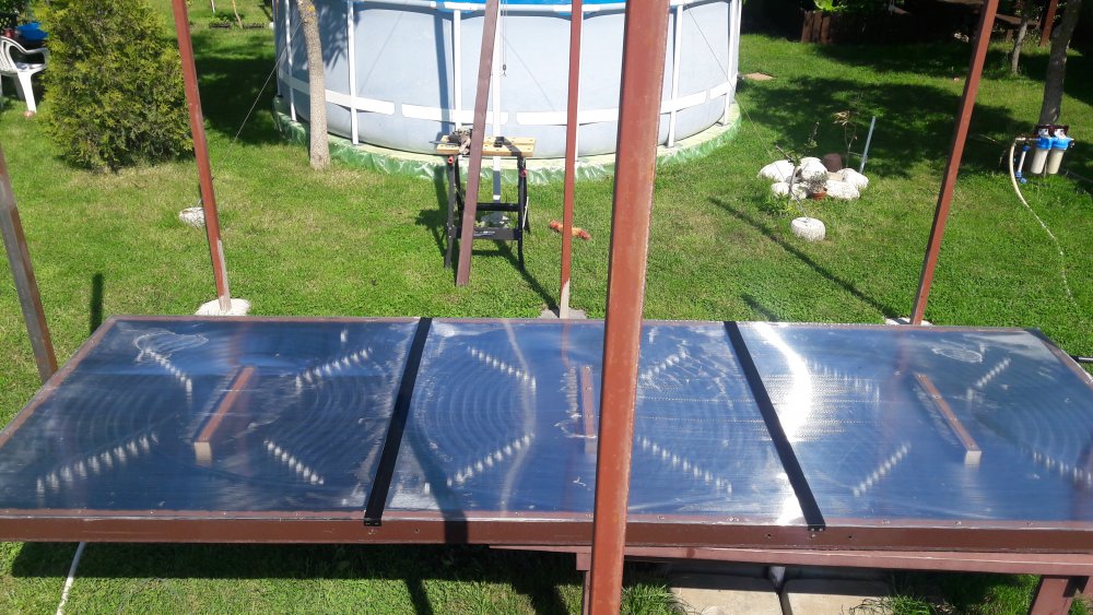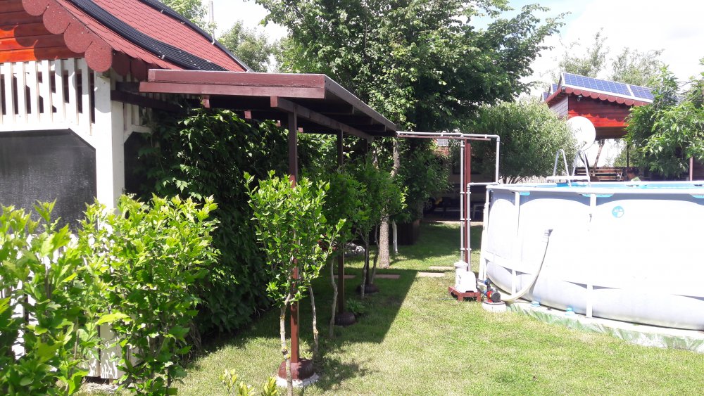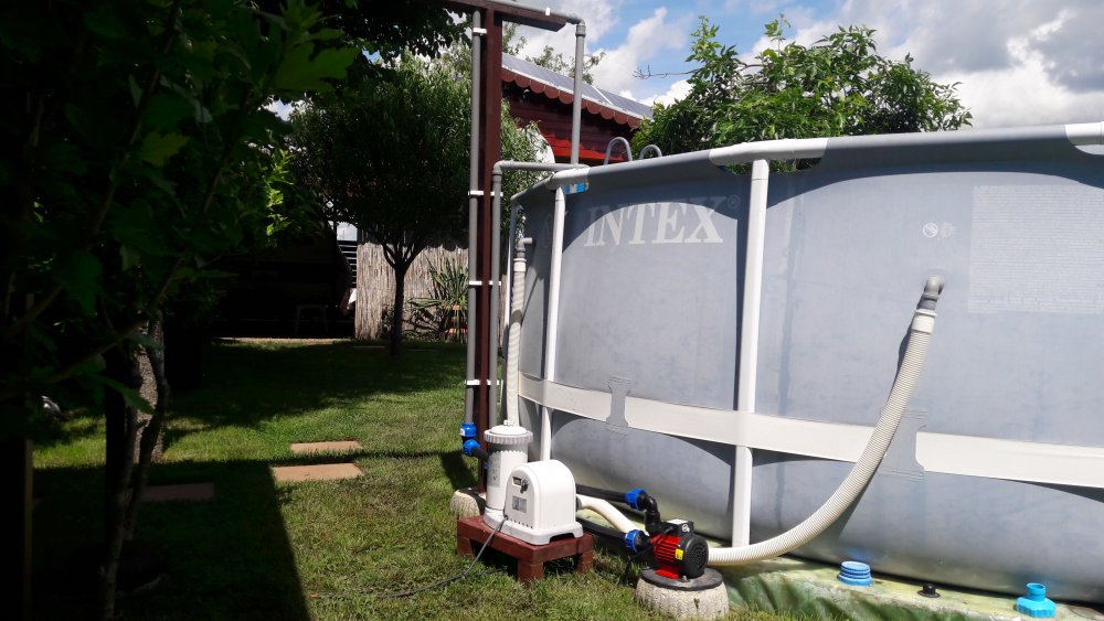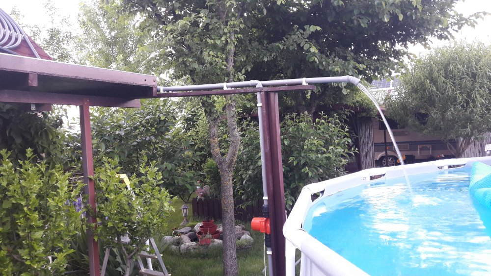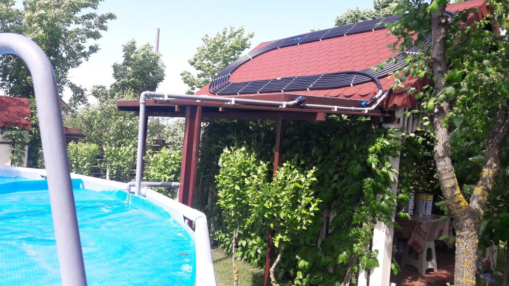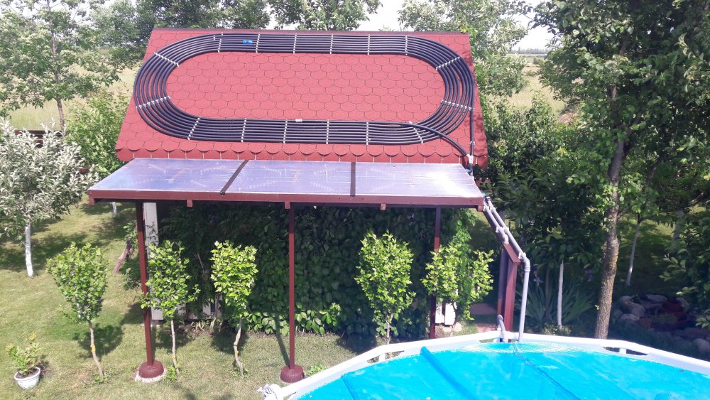 Pentru a crește cu câteva grade apa din piscină, am montat anul trecut o țeavă neagră de 32 pe foișor, cu pompă de recirculare care să-mi tragă apa rece de pe fundul piscinei, s-o plimbe putin pe acoperiș și s-o readucă caldă, incălzită de soare, înapoi în piscină.