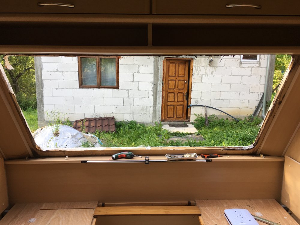 Am fost astazi si am cumparat un adeziv pentru geamuri de masina si am bagat pe sub cheder in coltul din stanga jos, iar sus am astupat golu de la bagheta care imbina panoul frontal cu partea de sus a rulotei.