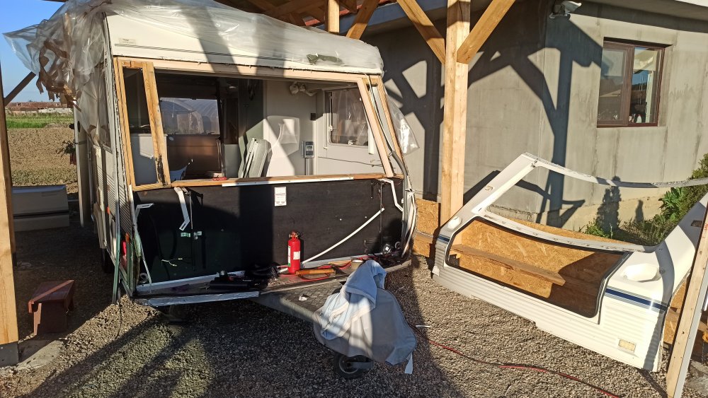 Va multumesc pentru sfaturi @Fejer Antal @Ciprian Mirescu @Florin Smolnicki @Bilti . Sipcile afectate sunt in mare parte schimbata, mai am cateva  dar s-a stricat vremea si nu pot scoate folia de pe rulota sa lucrez la ea. Nu voi lipi panoul fata de nimic, ce am observat la demontat, faptul ca erau cateva cuie...aprox 5 pe tot panoul, cu care banuiesc ca au pozitionat panoul. Intre rama geam si panoul fata am gasit mastic in loc de adeziv. Era din fabrica sau nu...nu stiu. Asa voi proceda si eu la montare + voi incerca sa introduc un pic de mastic intre cheder si panou. Voi vedea vara in caldura daca curge afara sau ramane acolo. Urmeaza lipirea panoului pe interior cu Den Braven Polyset, set de rasina bicomponenta + fibra sticla. Am gasit la Leroy Merlin Tg. Mures. Pe exterior voi efectua sudura in plastic, inclusiv armare cu plasa de otel. Evident...mai am de curatat mastic de la sine, de la imbinari...dar spre fericirea mea am si ajutor la curatat, sunt ajutat de sotie la indepartarea masticului. Se apropie cu pasi repezi concediul de vara :OK: