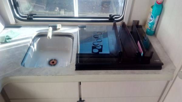 aragaz, frigider, chiuveta, toate pe drapta cum intri in rulota. Am pe cineva care mi-a subliniat ca este important sa nu am frigiderul cu ventilatia in cort...