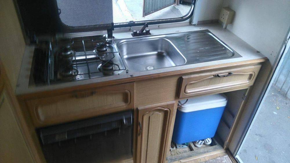 aragaz, frigider, chiuveta, toate pe drapta cum intri in rulota. Am pe cineva care mi-a subliniat ca este important sa nu am frigiderul cu ventilatia in cort...