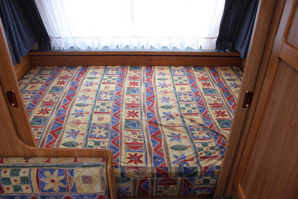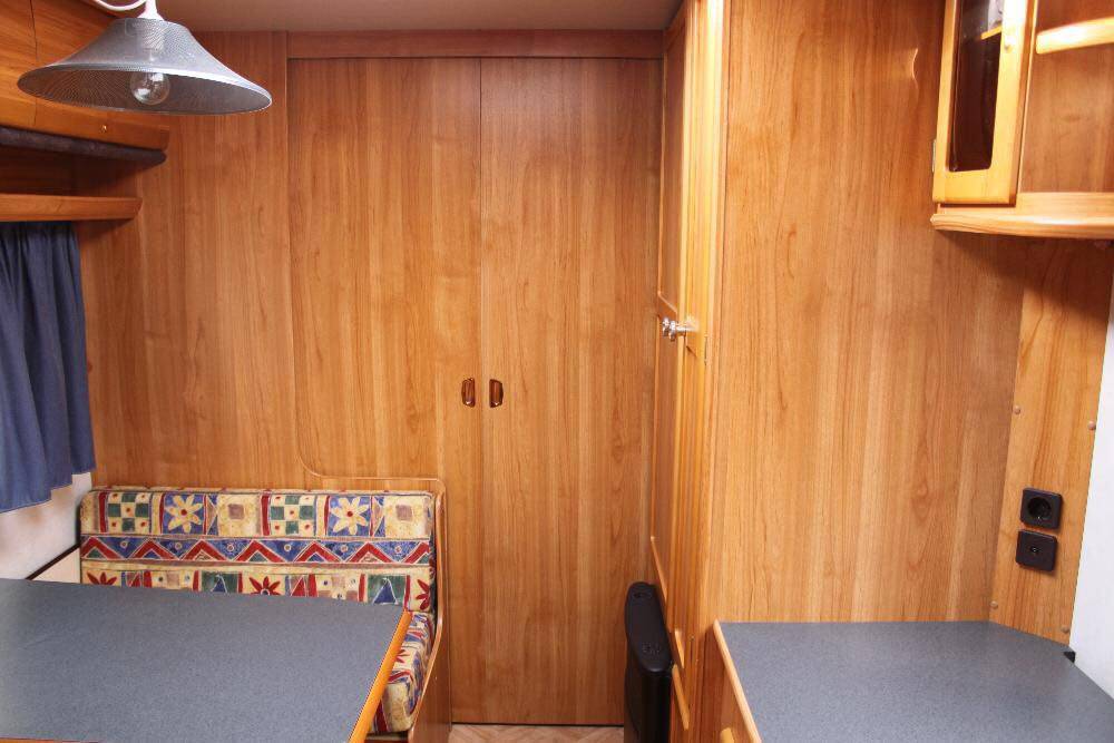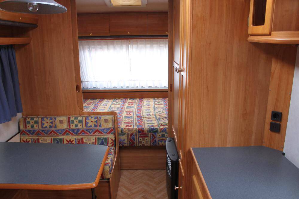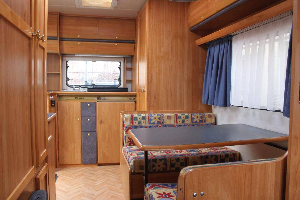 In partea din fata este patul matrimonial pe latime care se separa de living cu doua usi culisante, pe mijloc partea stanga masa cu doua canapele de o parte si cealalta, in dreapta dulapul de haine, soba Truma si multe spatii depozitare.In partea din spate se afla bucataria si baia.Este dotata cu panou solar, baterie, trumavent, boiler, bazin apa in interior.