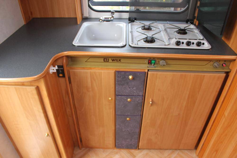 aragaz, frigider, chiuveta, toate pe drapta cum intri in rulota. Am pe cineva care mi-a subliniat ca este important sa nu am frigiderul cu ventilatia in cort...