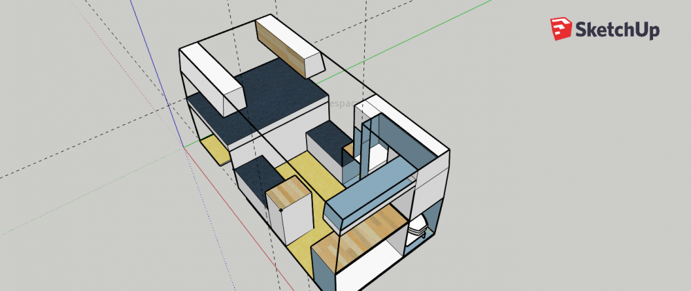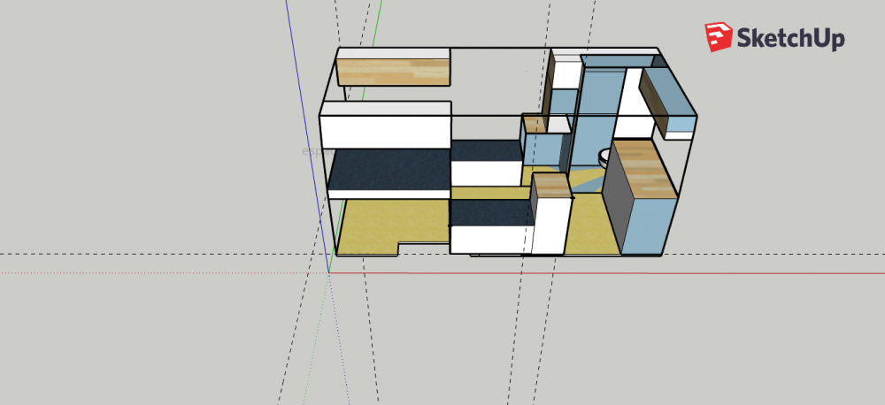 Am găsit un model 3D pe dimensiunile dubei mele, la care voi aduce mici modificări la mobilier, cel suspendat de deasupra patului va fi mai lung, iar dulapul dintre baie și canapele va fi aceeași lățime de sus până jos. Voi renunța și la mobilierul suspendat de deasupra bucătăriei.