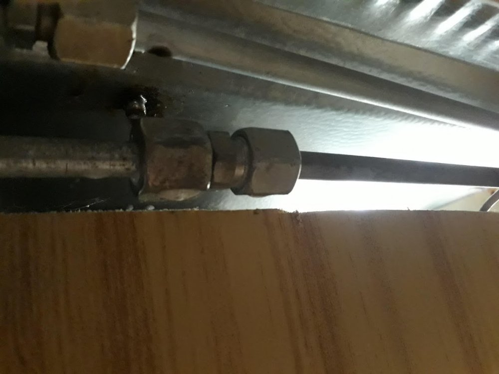 Povestea este urmatoarea: am pus pe rulota un RM 4270 in loc de RM 270 care ar fi fost cel cu care a fost dotata rulota din fabrica. Exista o diferenta mica intre ele la robineti, 270-ul are robinetul de gaze pe care-l rotesti casa reglezi intensitatea flacarii si-l si apesi ca sa "amorsezi" termocupla; 4270 are robinete ptr. gaz, cu unul dai drumul la gaz si-l apesi, cu celalalt reglezi flacara. Din cauza asta si dn cauza pipelor de la aragaz a trebuit sa mut blocul robinetelor mai in dreapta, ca sa aibe loc sub aragaz si sa se potriveasca si cu gaurile din masca. A trebuit sa dau o gaura noua ptr. butonul cu piezo care, evident, s-a mutat si el. Mutand povestea, conducta de alimentare a intrat in compartimentul  de sub chiuveta, presand cu un cot pe peretele de placaj vertical.
