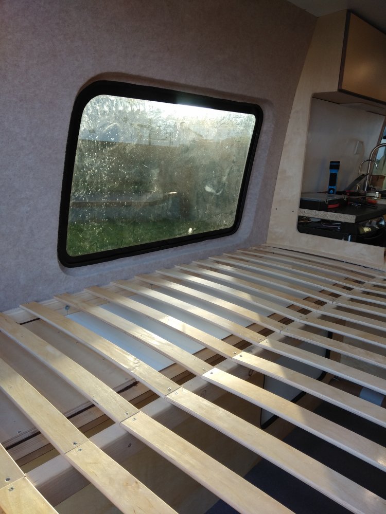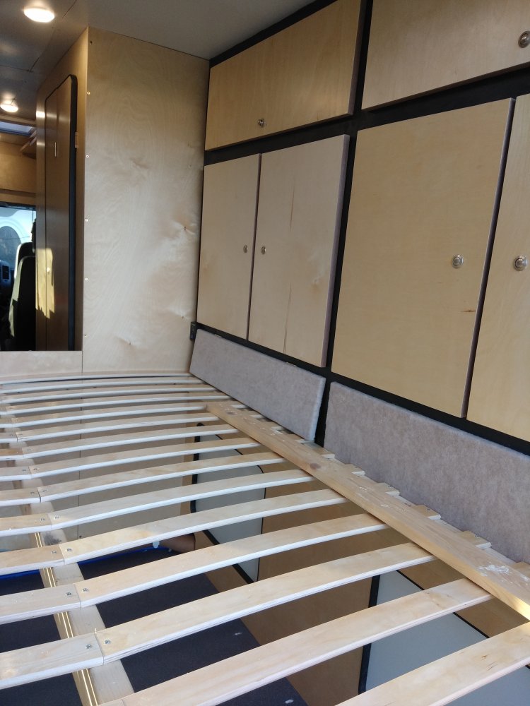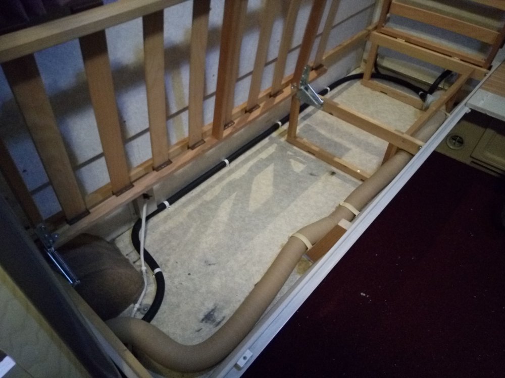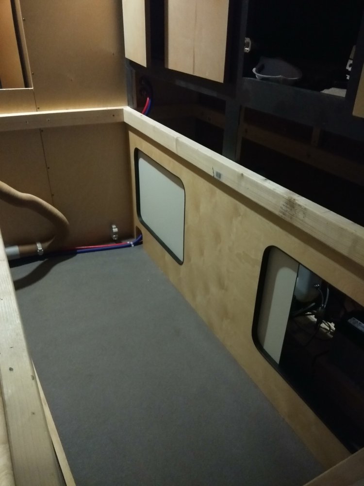 Dupa cum se poate vedea in partea stanga, am inceput constructia compartimentarii spatiului de sub pat. Am mers pe varianta a doi pereti verticali stanga-dreapta care vor masca toate instalatiile lasand loc pe mijloc de 90cm pentru bagaje/scaune pliante, etc. Din cauza spatiului ingust am renuntat in a face usi pentru accesul la instalatii, mi-a venit idea acestor panouri glisante :default_big_grin: