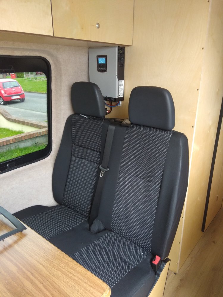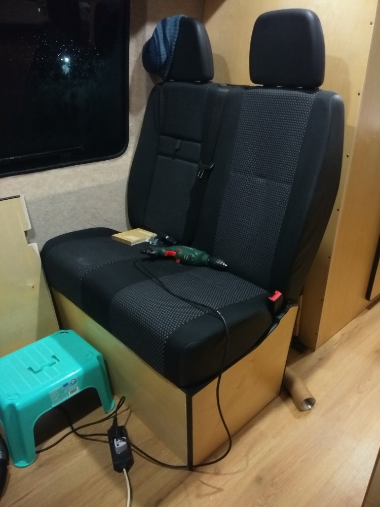 Deasemenea am schimbat sistemul de prindere al banchetei, am scos cadrul de lemn si l-am inlocuit cu baza metalica originala pe care am imbracat-o in placaj pentru estetica. Sub bancheta se gasesc cele 2 baterii de 100Ah: