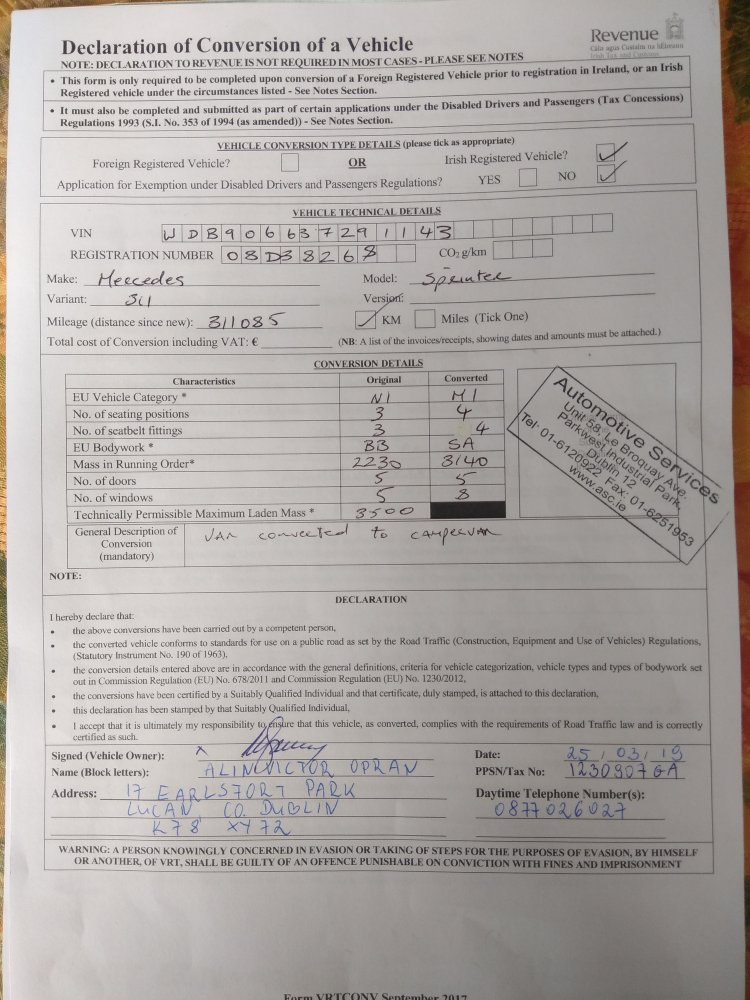 Dupa fix 2 saptamani de cand am trimis actele pentru calcularea taxei VRT pentru re-categorizarea ca si camper...... am primit o adresa oficiala in case se mentioneaza ca nu au putut procesa cererea mea deoarece nu era trecuta in solicitare (formular) suma totala a conversiei. Asta desi am atasat toate facturile/chitantele.