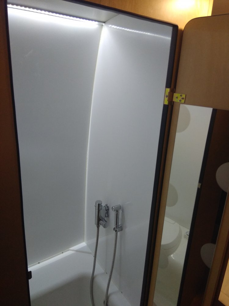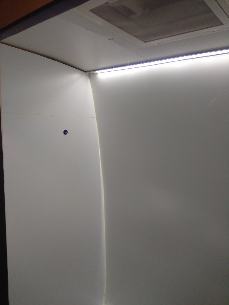 Am montat si benzi LED 2850 in profil de aluminiu deasupra locului cu masa, in spatiul de depozitare deasupra cabinei, la baie si in spatiul de depozitare de sub pat: