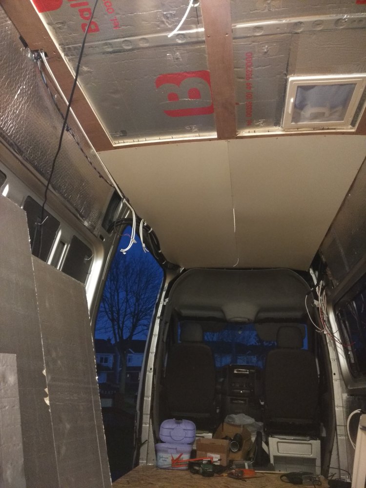 Fiindca a fost un weekend cu vreme in general frumoasa, 12 grade cu soare, am profitat sa continui cu tavanul. Am incheiat izolarea tavanului cu placa rigida izolatoare de 30mm si am trecut la partea de finisaj cu placaj mdf alb de 3mm. Am realizat ca fiind foarte flexibil nu se poate monta direct pe structura nervurilor de metal astfel ca am montat o caroiaj din placaj gros de 12mm si lat de 10cm: