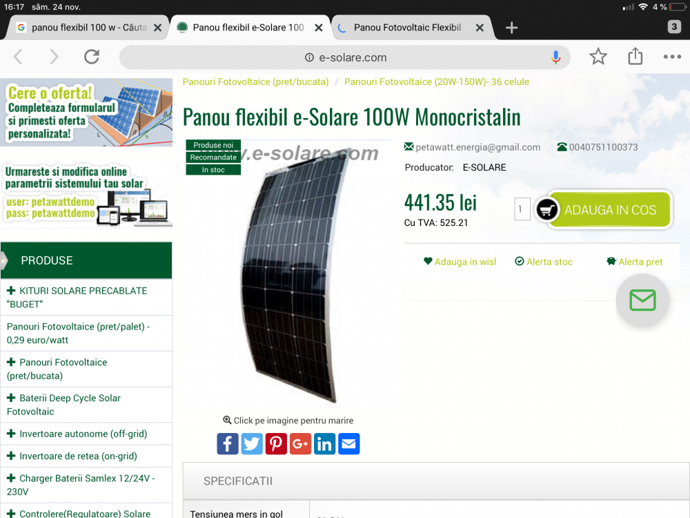 Eu am lut panou rigid monocristalin de 100W, regulator de 20A si 5 m de cablu solar de 4 mm cu 460 lei. Numai panoul e 370. Semiflexibil am gasit la 460 lei, tot de 100.  Am luat rigid si l-am montat la fel ca pe primul la 1 cm deasupra acoperisuluil, sa circule aerul pe dedesubt. Cu cat se incalzesc mai tare cu atat scade randamentul. Vara cele semiflexibile, daca sunt lipite,  au randament cu pana la 30% mai putin, cel putin asa mi-a zis unul care se ocupa cu asta.  Ambele panouri le-am lipit cu coltare. Deci, am optat pentru varianta cu panouri rigide, pentru ca sunt mai solide, au randament mai ridicat cand e cald si se pot inlocui mai usor daca se intampla ceva cu ele.