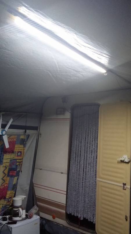 Pentru iluminat cortul eu am pus o lampa LED de 1 metru care functioneaza la 12V dar si la 220V cu ajutorul unui transformator.
