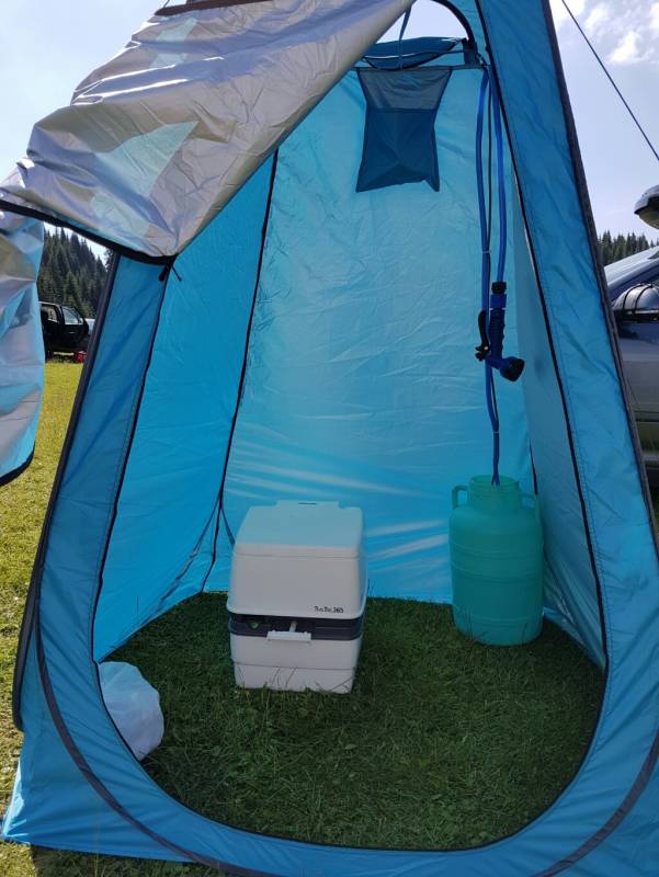 In apuseni I-am facut proba si la dush. Face fata cu brio. L-am amplasat putin mai in fata de carligul rulotei si m-am legat cu pompa ( i-am facut prelungire la cablu) de la priza care o am pusa in compartimentul buteliei. Am intins cablul si l-am legat cu un arici de cabina de dus ca sa stea intins pe sus si am bagat pompa in cabina pe usita de aerisire. In interior am prins intrerupatorul si celelalte tot cu un arici ca sa stea cat mai fixe. De asemeni am pus in el si wc. A fost super totul.