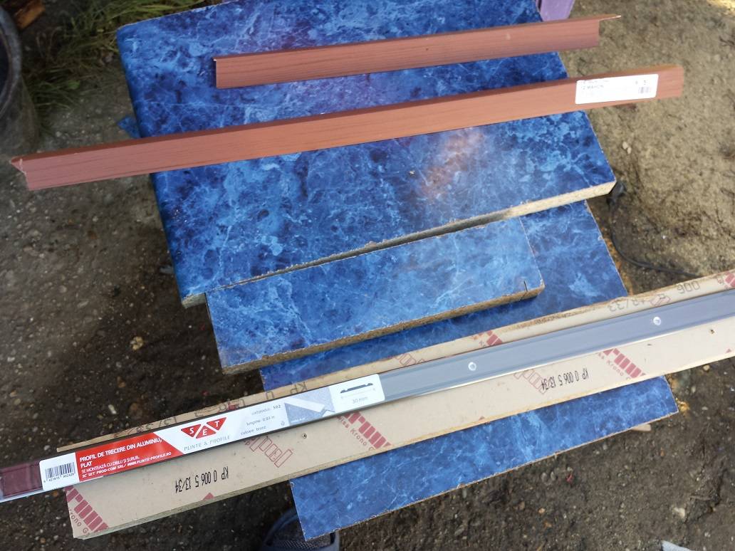 Am mai fost pe la magazine , cu toate ca in zona nu prea sunt multe si mai ales cu ce ai vrea sa cumperi , dar am improvizat, si am cumparat un profil de trecere din aluminiu pentru capete, un coltar din pvc pentru laterale , niste balamale si ceva holsuruburi.