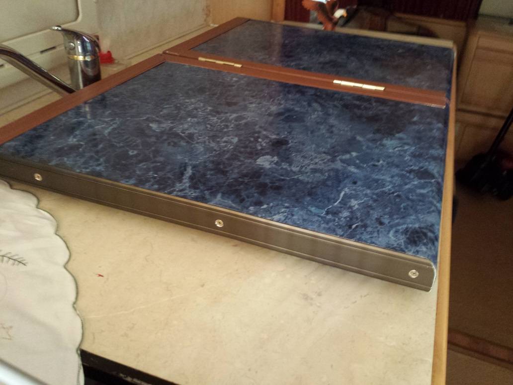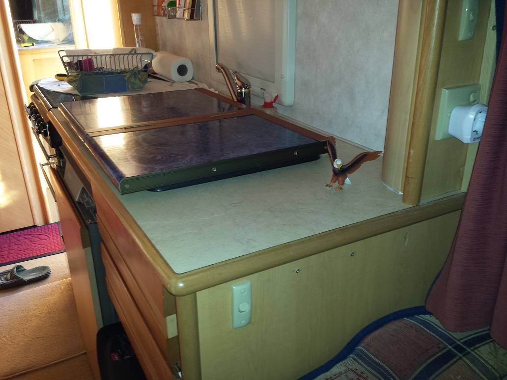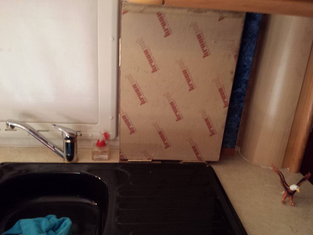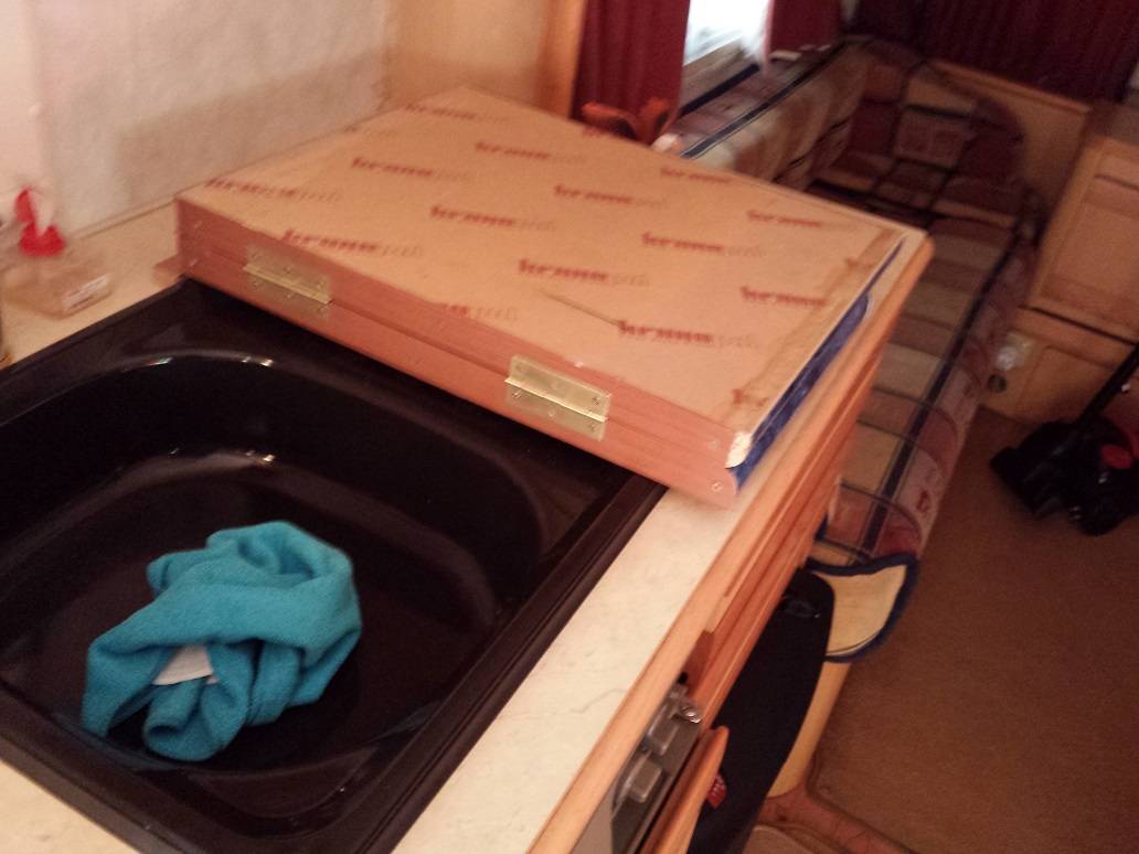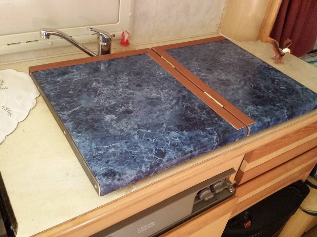 Am urmarit mai multe videoclipuri pe youtube si pe alte site-uri referitoare la rulote, in special la modelul pe care il am si eu, si am observat ca pe chiuveta mai toate au un blat cu balamale  care acopera chiuveta si totodata cred ca e util si daca vrei sa pui ceva pe zona aceea. Asa ca am luat masuri..., in sensul ca am cumparat o bucata de blat de bucatarie, nu am gasit culoarea respectiva , dar merge si asa...