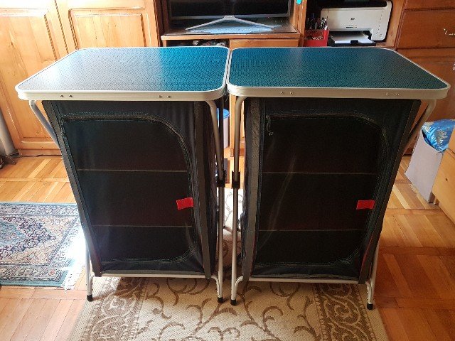 2 bucati de dulap cu 3 polite si plasa  aerisire si sa nu intre insectele. Buna de pus in cort si folosita si ca masa pentru preparare...60×45×90cm si volum 40l fiecare.
