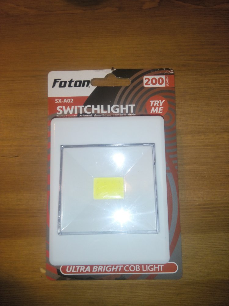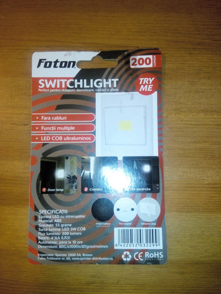 Am achizitonat zilele trecute de la Carrefour, o "lampa" cu led care este alimentata de 4 baterii tip AAA, are trei sisteme de prindere pe dublu adeziv, magnetic sau prin agatare. Partea interesanta este fluxul de lumina, mai precis 200 de lumeni. Alimentata de cele 4 baterii, are un timp de functionare de aprox.10 ore. Arata ca un intrerupator de perete si costa extrem de putin, doar 8, 5 lei. O gasiti intr un blister si pe el este inscriptionata firma care este Foton.