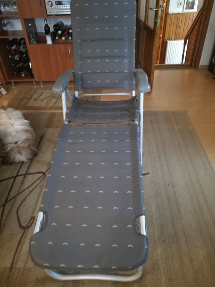 Scaune cu extensie pentru plaja. Se transforma într-un șezlong generos. Cadru din aluminiu, foarte confortabile. Singurul inconvenient, greutatea. Cele 4 bucăți cu extensii devin un pachet destul de greu.