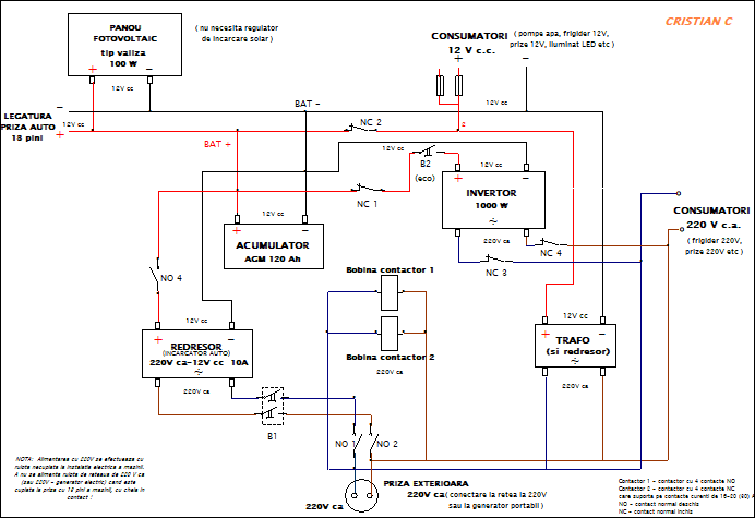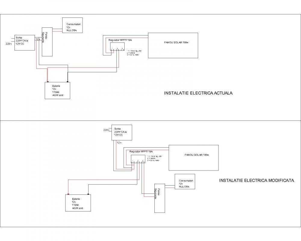 Cristian A 1.541 Semnalează Publicat 7 Mai, 2019 Am incercat si eu acum cca doi ani o schema de automatizare, conceputa de mine, care a mers. Am montat-o in locul celei originale ale rulotei sa vad daca functioneaza si a mers. Dupa doua luni am dat-o jos, ca erau doua automatizari care faceau acelasi lucru. Nu e trecut regulatorul, care la mine era prins pe panou si care trebuie inserat dupa panou. Ideea de baza era sa pot alimenta acumulatorul sau consumatorii rulotei prin orice metoda, fara a se intalni diferite tensiuni in circuit. Am folosit contactori, de la alte automatizari, dar cu relee e mai ok si ocupa spatiu mai putin. Am postat pe undeva pe forum "automatizare rulota" sau ceva in genul. Se poate simplifica, in functie de cerinte. 2 1 Distribuie această postare Link către postare Distribuie pe alte siteuri