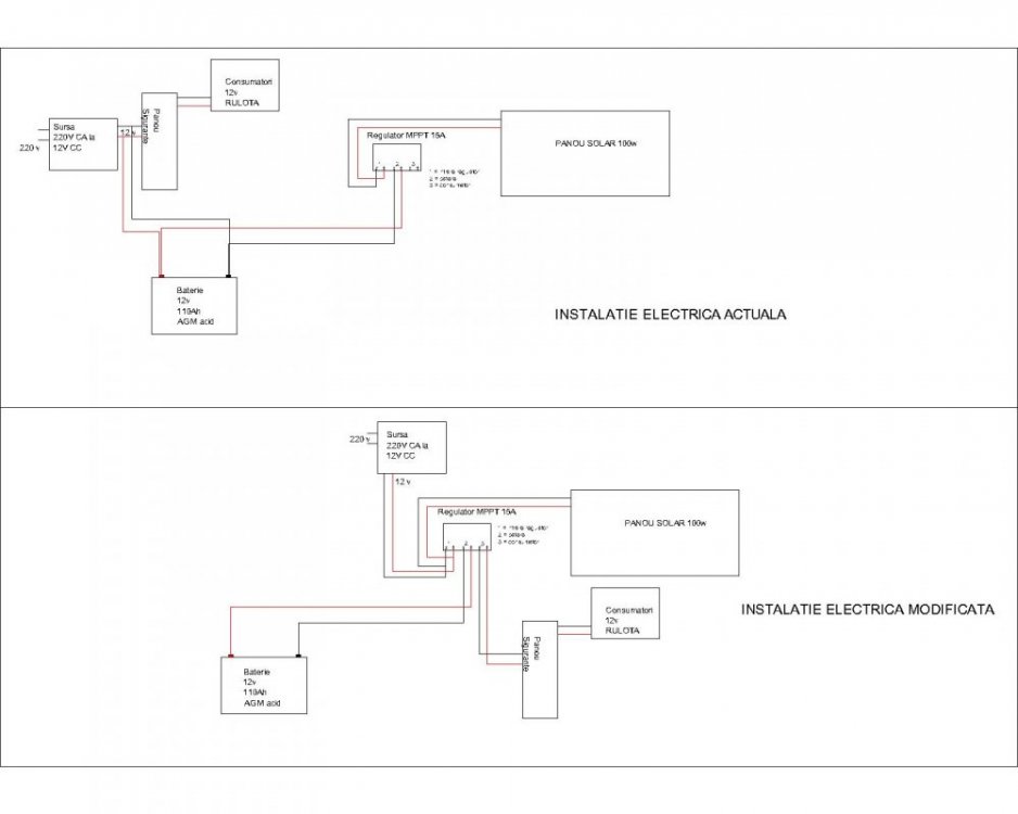 Mihai K 20 Semnalează Publicat 15 Mai, 2019 Salut Andrei. Poti sa faci asa: Din 220v folosesti un redresor (in comutatie, Meanwell sau Samlex, astea le recomand) care-l conectezi direct la acumulator. Redresorul atunci cand nu mai incarca tine acumulatorul in float (~13.6-13.8v) si poate sa alimenteze si consumatorii (se comporta ca o sursa normala). Panoul fotovoltaic il treci obligatoriu prin regulator si regulatorul il legi la acumulator. Din acumulator iesi spre consumatori prin sigurante!! Cablurile intre regulator/redresor/panou sigurante cat mai scurte posibil!!! Distribuie această postare Link către postare Distribuie pe alte siteuri