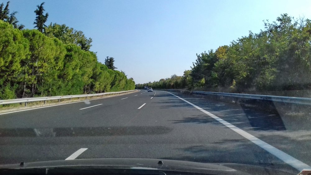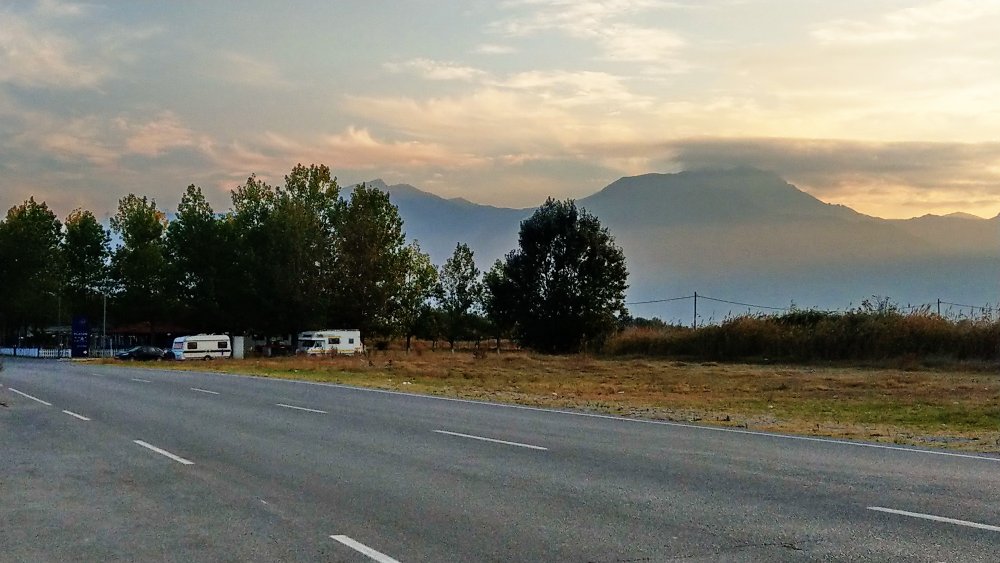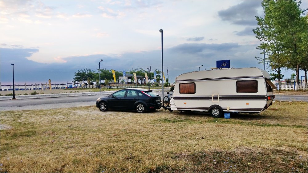 Suntem harnici, ne trezim devreme, mergem pentru o ultimă oră la plajă, înotăm puțin după care ne pregătim. Strângem bicicletele, ridicăm ancora, legăm rulota și pornim. Oprim la ultima benzinărie din Grecia , pt o mică pauză de răcoritoare sau sandwich. Au o parcare imensă unde cred că se poate campa pentru o noapte, au și parcare de camioane. Benzinăria este una tip old school, cu farmec pt mine, iar în timp ce stăteam la umbră ca să mănânce copiii observ un vechi service auto undeva jos, se coboară pe lângă stație, dar ochii mei de pasionat auto se opresc pe un BMW E30 vechi și un Mercedes ce pare 190.